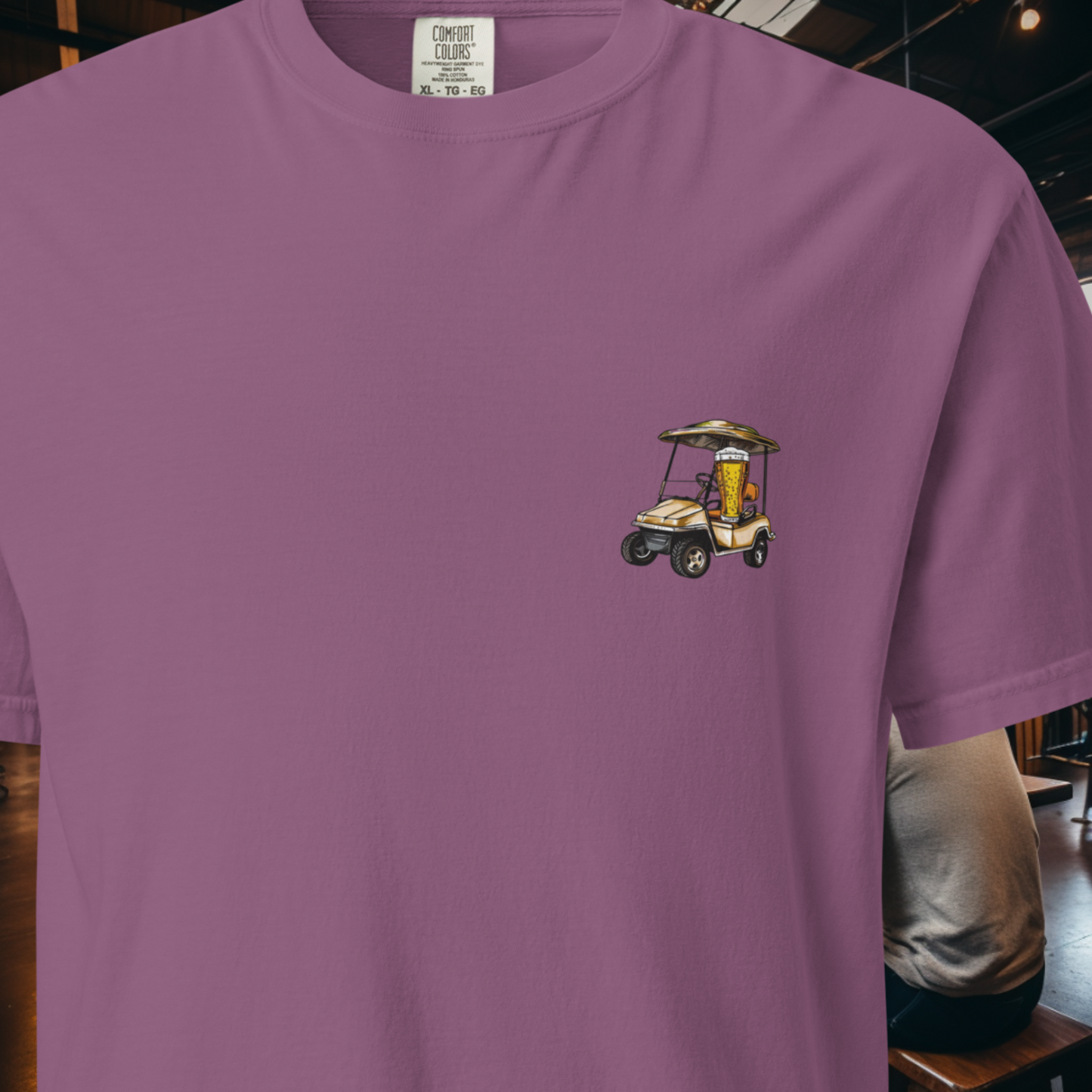 Introducing the 'Designated Driver T-Shirt' from Craft Brewing Collective – where craft beer and golfing greens collide for a tee-time like no other! This eye-catching tee boasts a delightful front design featuring a cheerful beer behind the wheel of a golf cart, adding a playful twist to your golfing adventures.